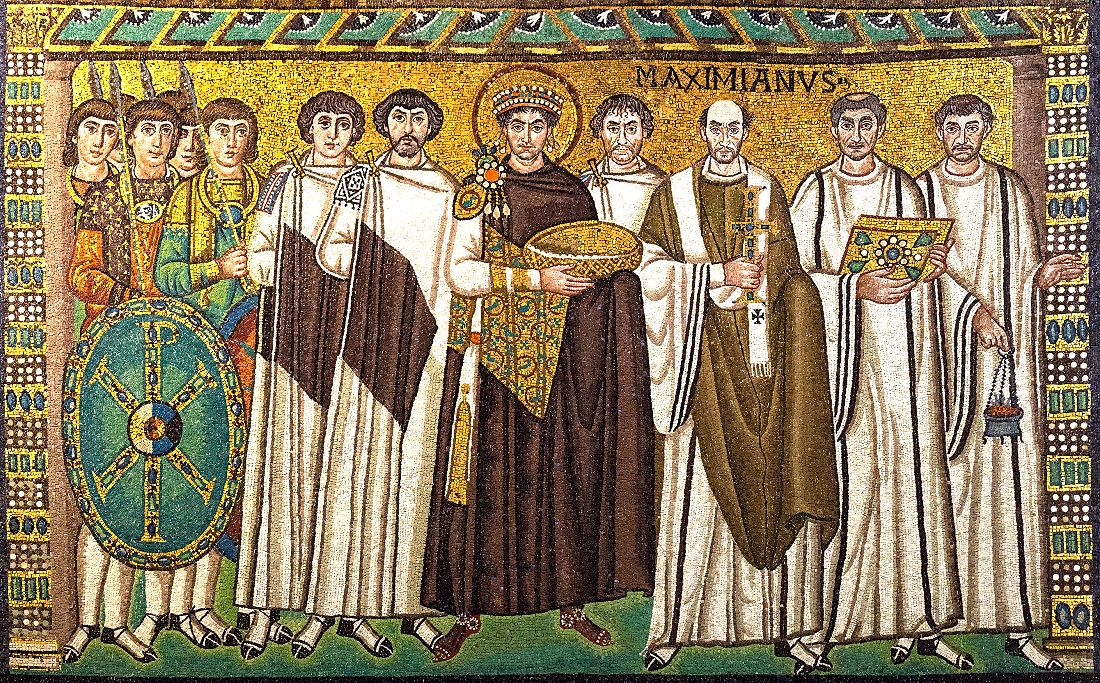 L'empereur Justinien vêtu de pourpre et sa cour. Mosaïque de la Basilique San Vitale, Ravenne, Italie (Wikimedia Commons)